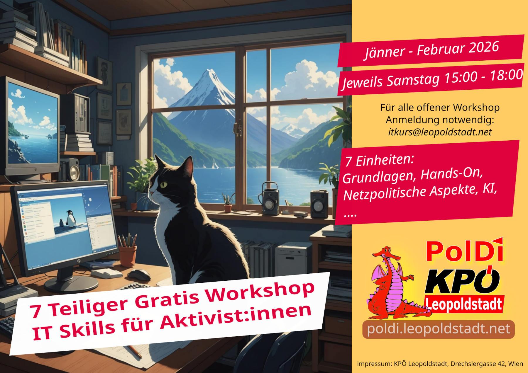 Ein Flugblatt layouten? Effizient Social Media benutzen um unsere politischen Inhalte zu transportieren und Aktivist:innen zu vernetzen. Mit den Aktivist:innen effizient online an gemeinsamen Projekten arbeiten. KI Benutzen? Das und mehr lernt ihr im 7 teiligen PolDi Workshop "IT-Skills für Akivist:innen" Neben den praktischen, "Hands-On" Know-How geht es dabei auch um die politischen Hintergründe dieser Technologien. Welche dieser Technologien werden benutzt um uns zu kontrollieren und zu überwachen und welche Technologien haben das emanzipatorisches Potential? Der Workshop ist explizit auch für Anfänger:innen gedacht und beginnt bei sehr Einfachen Themen. Im hinteren Teil gibt es dann aber auch Themen für Fortgeschrittene. Der Workshop ist an den Bedürfnissen von Aktivist:innen ausgerichtet aber ist auch für alle Interressierten offen. Der Workshop soll auch Raum für Diskussion und Austausch bieten - immerhin haben ja viele von uns schon Erfahrungen mit manchen der Themen.