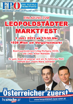 Der Marktamtsabteilung für den 2. u. 22. Bezirk wurde durch die Gebietsbetreung für den 2. Bezirk, mitgeteilt, dass sie unter dem Deckmantel des AGORA-Kunststandes am Vorgartenmarkt eine "Gegenveranstaltung" zu dem genehmigten "FPÖ-Fest" am 01. Juli 2011, wie aus dem Flugblatt hervorgeht, abhalten wollen.