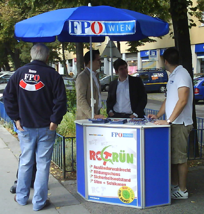 Die Blauen dürften wohl von unserer Aktion am Vorgartenmarkt irgendwie angetan gewesen sein. Wie sonst ist es zu erklären, daß eine aufmerksame Bezirksbürgerin am 16.8. einen Infostand der FPÖ genau an jener Stelle erspähte, die wir zuvor für unseren friedlichen Protest gegen die Rechten gewählt hatten?