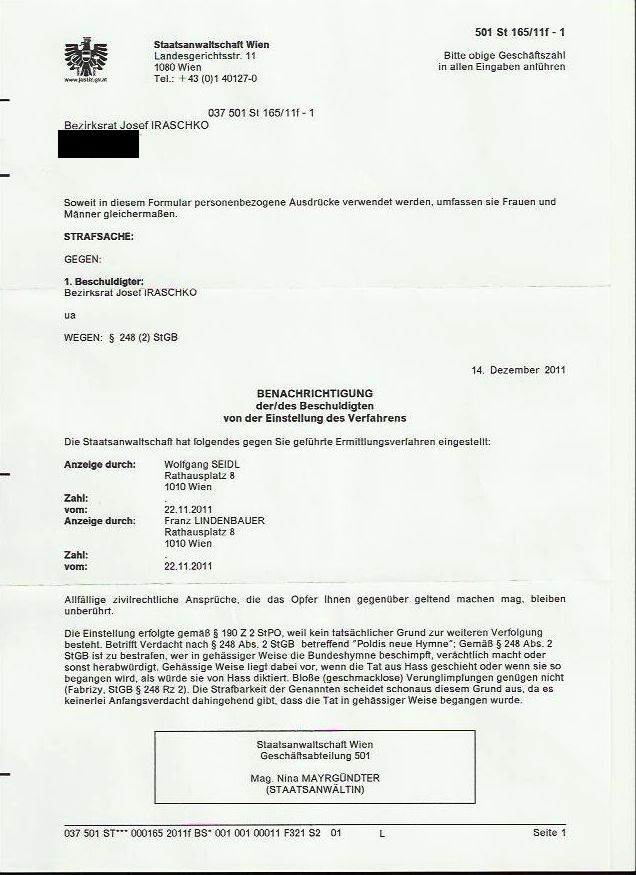 Die zuvor bereits im Standard und in den Bezirksblättern publizierte Hymne wurde anlässlich des Nationalfeiertags in der PolDi-Zeitung auf Seite 5 ein weiteres mal abgedruckt. Nun, einige Monate später, flatterte dem KPÖ-Bezirksrat Josef Iraschko ein Schreiben der Staatsanwaltschaft ins Haus: Er war als Medienverantwortlicher wegen "Herabwürdigung des Staates und seiner Symbole" angezeigt worden.