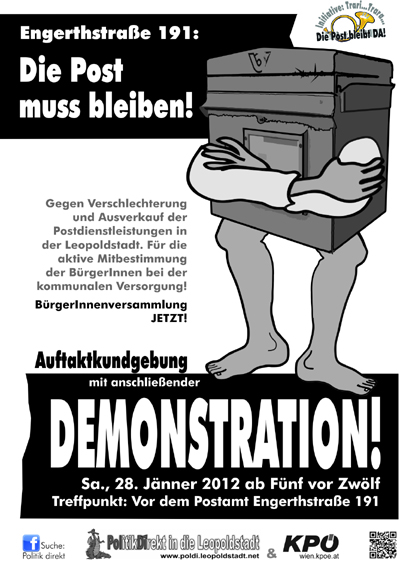 Dazu KPÖ-Bezirksrat Josef Iraschko: "Die von uns geplante Demonstration richtet sich also gegen die Schließung des Postamtes Engerthstraße 191 und gegen jede weitere Verzögerung und für die Abhaltung einer baldigen BürgerInnen-Versammlung."