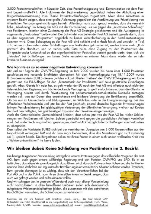 Es gilt daher, ein weiteres Mal dem Widerstand gegen die Schließung unserer Postämter Nachdruck zu verleihen. Am besten durch die Teilnahme möglichst vieler LeopoldstädterInnen an der BürgerInnenversammlung!