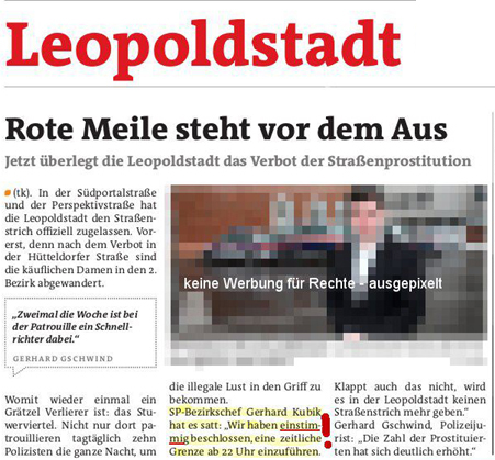 Absurd und unverständlich ist auch die Aussage des Bezirksvorstehers Gerhard Kubik (SPÖ) in der "Bezirkszeitung", in der er von einem "einstimmigen Beschluss" für ein solches Prostitutionsverbot phantasiert.