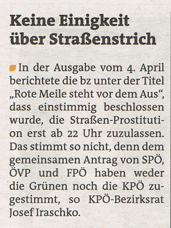 Wie PolDi berichtete, war die Darstellung in der Bezirkszeitung unrichtig. Demnach hätten alle Fraktionen dem Antrag auf zeitliche Einschränkung bzw. Verbot von Prostitution in der Leopoldstadt zugestimmt. KPÖ Bezirksrat Josef Iraschko weist darauf hin, dass sowohl KPÖ als auch Grüne dem Antrag von SPÖ, ÖVP und FPÖ nicht zugestimmt haben.
