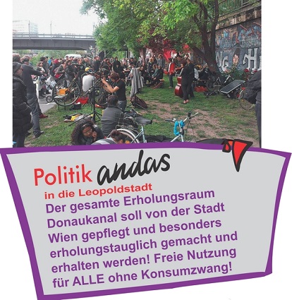Der Widerstand z.B. gegen das geplante Monsterprojekt „Sky&Sand“ am Donaukanal (Gastrotempel mit 600 Sitzplätzen statt einer öffentlichen Wiese) wird beharrlich sein müssen. Denn wir stehen erst am Anfang. Das alte Spiel: man wirft uns ganz gezielt einen dicken Knochen hin an dem wir uns abarbeiten und abreagieren sollen, während hinter den Kulissen die Entscheidungen getroffen werden oder schon sind, wie es von der Bezirksführung bei der Grün- und Erholungsfläche „Kaiserwiese“ sattsam vorgezeigt wurde.