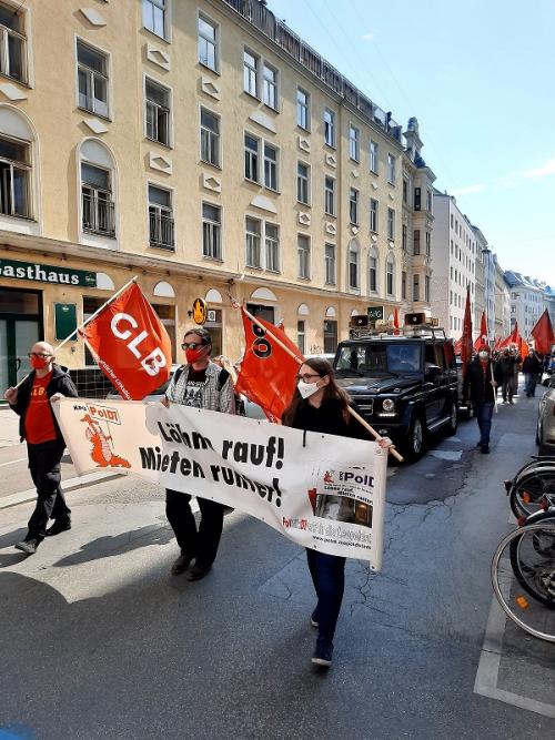 KPÖ Leopoldstadt und PolDi führten die Kundgebung einmal mehr mit der weiterhin gültigen Forderung: "Löhne rauf, Mieten runter" an. LINKS-KPÖ BezirksrätIn Sophie Apfler, die mit vorneweg dabei war, dazu: "Es gab viele solidarische Rückmeldungen zu diesem wichtigen Thema, dass uns alle betrifft."