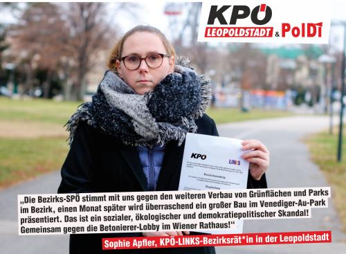 In der Bezirksvertretungssitzung vom 16.11.2021, also vor einem Monat, stimmte die gesamte SPÖ-Fraktion einem Resolutionsantrag der KPÖ&LINKS Bezirksrät*innen Josef Iraschko und Sophie Apfler zu, der folgendes besagte: „Die Bezirksvertretung Leopoldstadt spricht sich gegen jede Reduzierung der vorhandenen Parks und Grünflächen im Bezirk aus“. Die Ignoranz dieser Entscheidung zeigt, wie ernst sich die SPÖ in ihrem Abstimmungsverhalten selbst nimmt.