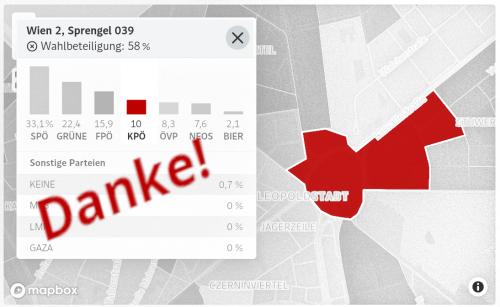 4.8% der Leopoldstädter:innen haben KPÖ gewählt. Im Sprengel 39, rund um den Praterstern, waren es sogar 10%! Ein herzliches DANKE! an alle die uns ihr Vertrauen geschenkt haben! Auch wenn es für einen Einzug ins Parlament nicht gereicht hat.